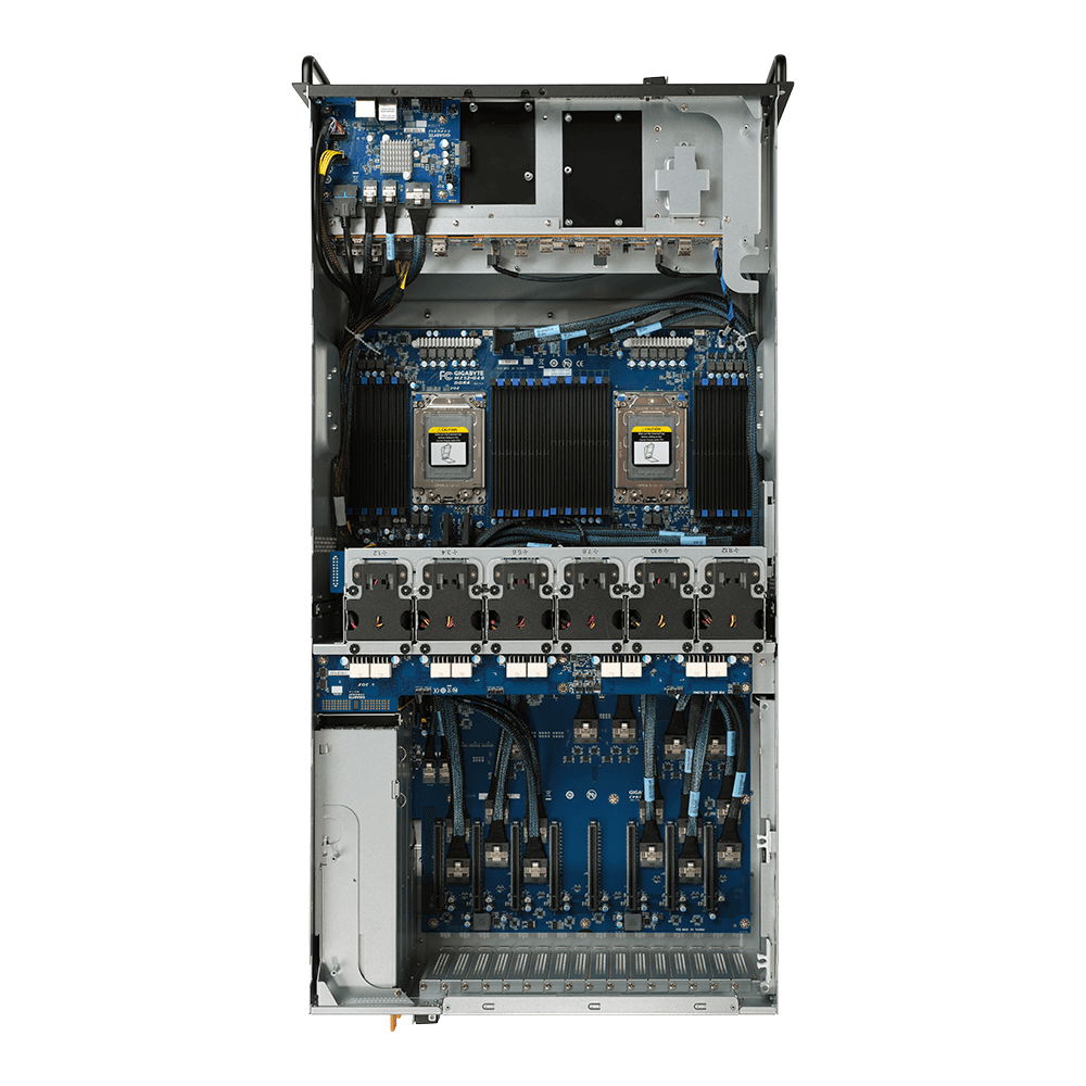 The G482-Z51 is one of the world’s first PCIe Gen 4.0 GPU server systems to be released to the market, featuring support for up to eight dual-width PCIe Gen 4.0 GPU cards (with each GPU connected directly to the processor via PCIe root). It is ideal to integrate an “AMD on AMD” solution using 2nd Gen EPYC processors together with the Radeon Instinct MI50, the world’s first 7nm, PCIe Gen 4.0 data center GPU, or with other Gen 3.0 or Gen 4.0 GPU cards for applications such as deep learning, cloud gaming or video streaming.